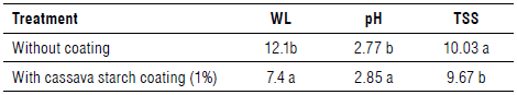 The coating of fruits with cassava starch-based biofilm improves WL, pH, and TSS. TA, TSS/TA ratio, and L* were not influenced by the use or absence of the cassava starch biofilm coating. All evaluated parameters were affected by the storage period. There was interaction for WL, FIR, H*, and C* (Tab. 1).