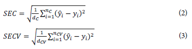 The criteria used to define the number of LVs were the following: the square root of the standard error of calibration (SEC) and cross-validation (SECV), defined according to Equations 2 and 3: