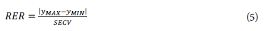 The range error ratio, RER, defined according to Equation 5, was calculated as follows: