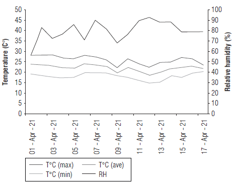 The climate of the region, according to the Koppen classification, is tropical rainy (Aw), with rainy summers and dry winters (winter precipitation less than 60 mm), with annual precipitation of 1,520 mm and an average temperature of 24. FC. During the experimental period, the climatic data were collected daily using equipment installed inside the greenhouse. (Fig. 1).