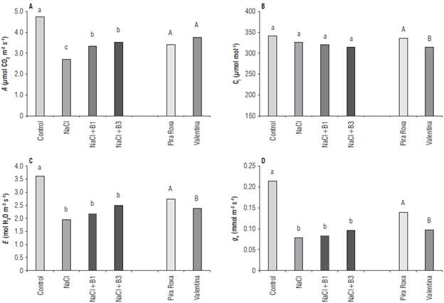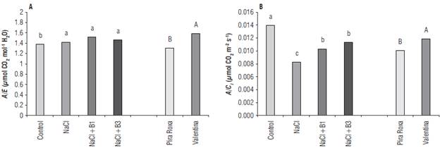 For water use efficiency, higher values were found for treatments in which irrigation with saline solution was used and, among the cultivars, Valentina was superior (Fig. 3A). In addition, for the efficiency of instant carboxylation, the control treatment stood out, followed by the treatments composed by the application of vitamins, both superior to the treatment composed only by irrigation with saline solution, while among the cultivars Valentina stood out (Fig. 3B).