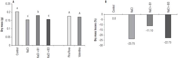 The cultivars had a similar response for the accumulation of dry mass, while, among the treatments, the superiority of the control was verified. However, among the treatments in which there was irrigation with saline solution, the superiority of the application of thiamine was observed (Fig. 4A), with lower percentage losses of dry mass (Fig. 4B).
