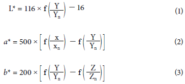 where L* is the luminosity, a* and b* are the chromaticity coordinates, Y is the relative luminance of the sample in RGB, Yn is the relative luminance of a white reference color (for example, D65); X, Y, and Z are the trichromatic coordinates of the sample in RGB; Xn, Yn, and Zn are the trichromatic coordinates of a reference white color (for example, D65); f(t) is a nonlinear function used to adjust the response of the human eye to different wavelengths (Sharma et al., 2004).