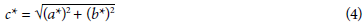 The color indicators L* (lightness) and the degree of redness (ratio s*/b*, where a* red - green and b* yellow - blue), the RGB information of the ROI's was extracted, from which the color was calculated in CIELab coordinates and these tests were analyzed in quintuplicate. This conversion is a mathematical process that allows colors to be represented in a three-dimensional space that is based on human perception. The Equations used to perform this conversion are as follows: