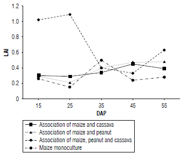In the maize-peanut-cassava association, the LAI was higher than 1.0 during the first 25 DAP and then progressively decreased to a value of 0.3 at 45 DAP; this subsequently increased to 0.6 at 55 DAP. The variability in LAI can be attributed to temporal and spatial differences as well as to factors affecting the crops, since this association involves the presence of multiple species; and greater variability is to be expected due to the influence of diverse factors (Nafarrate, 2017).
