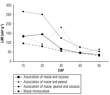 The association of maize, peanut, and cassava showed higher LAR values during the first 30 DAP, this is because the presence of more species in this treatment favors the production of a greater number of leaves. During this initial stage, the plants are in their vegetative development phase, implying significant leaf growth and, therefore, an increase in the LAI (Hernández et al, 1995). With respect to the peanut and maize association, LAR increased between 25 and 35 DAR This increase can be attributed to the growth in leaf size during this period. In general, all treatments showed a decreasing trend in LAR as time progressed. This phenomenon may be related to the fact that, as the plants grow, there is an increase in overall plant size, but a decrease in the increase of leaf area (Guevara & Guenni, 2007).