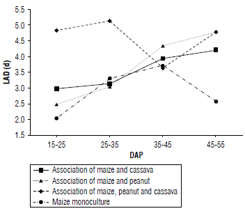 Figure 3 shows that the associations of maize and cassava and maize and peanut were similar in their LAD values at 25-35 DAP, reaching an average value of 3.1 d. However, both the association of maize and peanut, as well as the association of maize, peanut, and cassava, increased at 45-55 DAP with a value of 4.8 d, followed by the association of maize and cassava that showd a value of 4.2 d. The maize monoculture was the one that showed the lowest LAD, reaching a value of 2.6 d at 45-55 DAP.