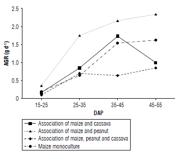 In the association of the three crops, a significant increase in AGR was not observed. However, it reached its maximum value of 2.3 g d-1 at 45-55 DAP. In comparison, the maize monoculture at 45-55 DAP had a value of 1.6 g d-1. In general, the association of maize and peanut showed the highest AGR as a function of DAP (Fig. 4). An increase in AGR was observed from 35-45 DAP for all treatments, except for the maize and cassava association. Possibly at this stage the plant was in its vegetative growth phase that implied a greater photosynthetic capacity and, therefore, higher biomass production (Barrera-Violeth et al, 2017).