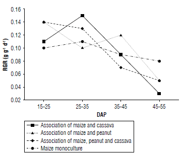 The association of maize with cassava reached its highest RGR at 25-35 DAP, with a value of 0.15 g g-1 d-1, and then it decreased considerably until 45-55 DAP with an RGR lower than 0.04 g g-1 d-1. The association of maize and peanut showed greater variability compared to the other treatments. The maximum value was 0.12 gg-1d-1 between 35-45 DAP, decreasing progressively until 45-55 DAP. The RGR of the association of maize, peanut, and cassava decreased after 35-45 DAP until the association reached a value of 0.05 gg-1 d-1 at 45-55 DAP. Finally, the maize monoculture showed no significant variation, remaining in a range of 0.10 to 0.08 gg-1 d-1 (Fig. 5).