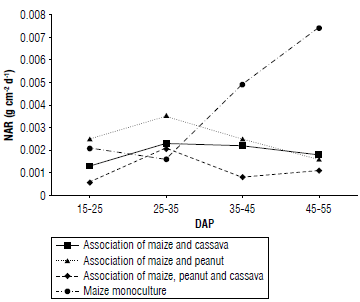 The associations of maize and peanut and maize and cassava presented a similar trend in the NAR; both treatments reached their maximum values at 25-35 DAP and then decreased until 45-55 DAP. In the association of maize, peanut, and cassava, a variation in the NAR was observed at 25-35 DAP, with a value of 0.002 g cm-2 d-1 followed by a decrease at 35-45 DAP. In contrast, maize in monoculture showed a different trend compared to the other treatments (Fig. 6) since it reached its highest NAR at 45-55 DAP with a value of 0.0075 g cm-2 d-1 suggesting that maize in monoculture achieved greater efficiency in the utilization of its foliage in that period compared to the other associations.