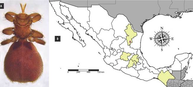 The adult specimens documented here (Fig. 1A) were collected from the wool of a domestic sheep from the locality of "La Escondida" (24°03'06.8" N, 99°57'30.2" W, 1838 m a.s.l.) in the municipality of Aramberri, Nuevo León, Mexico. They were identified using the keys found in the works of Maa and Peterson (1987) and Wood (2010): the absence of both wings and halteres identifies this genus and species. The specimens are deposited in the Entomology Laboratory of the Facultad de Ciencias Forestales of the Universidad Autónoma de Nuevo León under the voucher FCF-DIPTE003a-d.
