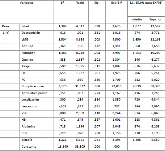 Los resultados del análisis univariado realizado en las variables biológicas se resumen en la tabla 1. Las variables que presentaron asociación simple con la NGAC fueron: la edad con p=0,002 OR=2,8 IC=1,5-5,9 lo que significó que hubo 2,6 veces más probabilidad que los casos con edades inferior al año desarrollaran la forma grave de la enfermedad en relación con los casos entre 1 y 4 años, sin representar esta asociación simple nivel de causalidad, lo cual se interpreta de igual forma para cada una de las restantes variables. Desnutrición (0,017 OR=2,6 IC=1,1-5,7), la lactancia materna no efectiva (p=0,000 OR=4,9 IC=2,8-8,7) y los antecedentes de IRAs (p=0,000 OR=2,9 IC=1,7-4,9).