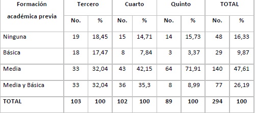 En el total de estudiantes, asi como en cada año académico, la mayoría de los estudiantes (83.67 %) refiere tener una formación académica media y/o básica en Enfermería antes de iniciar los estudios de la licenciatura. (Tabla 1).