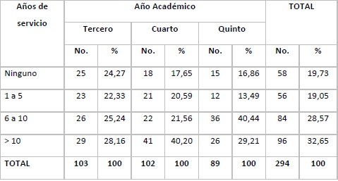 En general predominan los estudiantes con más de 10 años de trabajo en los servicios de salud (32,65 %). Por año académico, en tercer año predominan los estudiantes con más de 10 años de servicio aunque con poca diferencia con la proporción de estudiantes con 6 a 10 años de servicio; en cuarto año predominan los estudiantes con más de 10 años de servicio y en quinto año predominan los estudiantes con 6 a 10 años de servicio en salud. (Tabla 2).