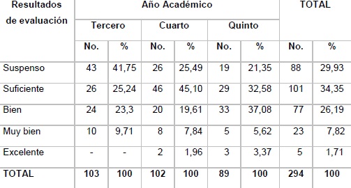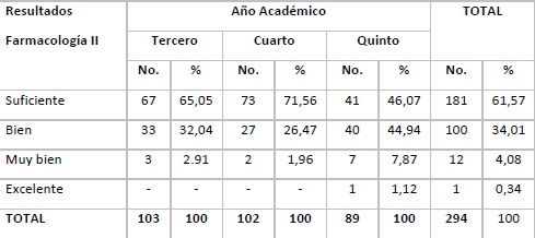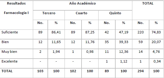 Results: The results in Pharmacology I were mainly satisfactory (74.83%); and in Pharmacology II they were satisfactory (61.57%) and good (34.01%). The results of the evaluation related to the topics were: third-year students: failed (41.75%); fourth-year students: satisfactory (45.10%), and fifth-year ones: satisfactory (32.58%) and good (37, 08%).