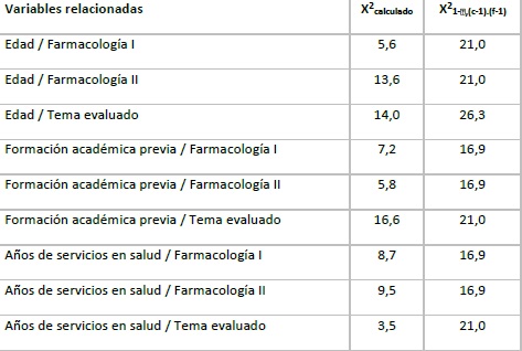 No se encontró relación significativa entre la edad, formación previa en Enfermería y años de trabajo en los servicios de salud, con los resultados académicos en Farmacología I, Farmacología II y la evaluación del tema fármacos antimicrobianos y antiparasitarios.