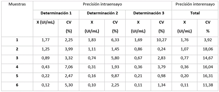 Para su determinación se seleccionaron seis sueros de diferentes concentraciones y se evaluaron por triplicado bajo tres condiciones diferentes: tres analistas un mismo día, un mismo analista mediante ensayos en paralelo y en días diferentes. Para la precisión tanto intraensayo como la precisión interensayo se calculó el CV mediante la fórmula: CV= (Desviación estándar (DE)/Concentración Promedio) x 100. El CV no debe superar 20% en la interensayo, para considerarse que la precisión es adecuada.13,14,15