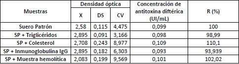 Como se observa en la Tabla 2, después de la adición de sustancias de interferencia al suero patrón los valores de recuperación de antitoxina diftérica que se alcanzaron estuvieron entre 90 y 110%, valores establecidos como aceptables para una buena especificidad en ensayos inmunoenzimáticos, lo que demuestra que ninguna de las sustancias que normalmente pueden estar presentes en la muestra interfieren en la capacidad del ensayo para detectar el analito.13,15,16,17