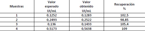 La exactitud se determinó mediante ensayo de recuperación. Se prepararon cuatro muestras a partir del suero estándar de la OMS de concentración conocida y se evaluaron por triplicado. El porcentaje de recuperación se determinó por la siguiente fórmula: R=valor obtenido/valor esperado*100. Se tomó como criterio de aceptación que R estuviera dentro del intervalo de 90 a 110%.13,14,15,16) Se utilizó la Prueba t para muestras pareadas para determinar la diferencia entre el valor esperado y el obtenido, con un nivel de significación de 0,05.