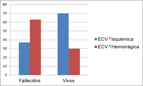 Se ingresaron 90 (55,2%) pacientes con el diagnóstico de ECV isquémica y 73(44,8%) con una ECV hemorrágica. El mayor número de fallecidos lo aporto la ECV hemorrágica 46(63%); sin embargo, los pacientes que egresaron vivos se correspondió en 70% con una ECV isquémica (p=0,000). (Figura 1).