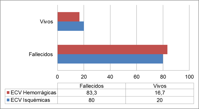 Un total de 36(78,3%) pacientes con ECV hemorrágica necesitaron ventilación artificial mecánica; de ellas, fallecieron 30 (83,3%) casos, por otro lado, la ECV isquémica contribuyó con un menor número de ingresos, tan solo 10 (21,7%); sin embargo, falleció 80%. (Figura 2)