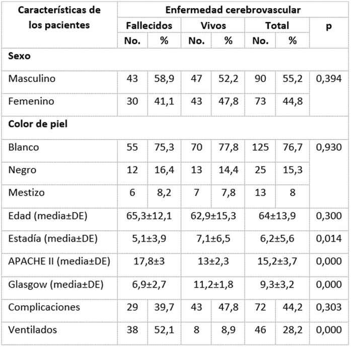 Durante el período estudiado, ingresaron un total de 163 pacientes con el diagnóstico de enfermedad cerebrovascular en la Unidad de Cuidados Intensivos, de los cuales 73 (44,8%) fallecieron y 90 (55,2%) egresaron vivos. La edad media fue de 64±13,9 no se mostraron diferencias significativas entre grupos (p=0,300). El sexo masculino y el color de piel blanca predominaron en los pacientes con 90 (55,2%) y 125 (76,7%) pacientes respectivamente aunque sin significación (p=0,394 y p=0,930). Un resultado revelador reveló la estadía en UCI con una media de 6,2±5,6 (p=0,014) y el APACHE II donde los fallecidos presentaron una media a las 24 horas del ingreso de 17,8±3 (p=0,00) .De manera similar, la puntuación de la Escala del coma de Glasgow al ingreso en pacientes que posteriormente fallecieron (6,9±2,7) presentó diferencias significativas entre grupos (p=0,000). Un total de 72 (44,2%) pacientes presentaron al menos una complicación y 46 (28,2%) del total necesitaron ventilación artificial mecánica con una significación p=0,000. (Tabla 1.)
