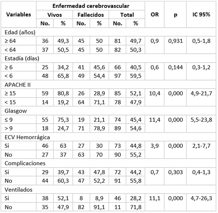 Results: The mean age was 64±13,9 (p=0,300). A total of 72(44, 2%) patients presented a complication, and 46(28, 2%) needed ventilation (p=0,000). The greater number of deceased resulted from hemorrhagic CVD 46(63%). Mortality in the ventilated patients was 83, 3%. The greater number of the 71 patients that presented complications died of respiratory sepsis, reporting 14(50%) patients. From the univariate analysis, the deceased patients presented an APACHE II≥ 15 (OR=10,4; p=0,000; CI 95%=4,9-21,7); a Glasgow scale ≤ 9 (OR=11,4; p=0,000; CI 95%=5,5-23,8); a hemorrhagic cerebrovascular disease (OR=3,9; p=0,000; CI 95%=2,1-7,7); and/or needed ventilation (OR=11,1; p=0,000; CI 95%=4,7-26,3). The multivariate analysis determined that the variables that were significantly related to mortality were the APACHE II ≥15 points (OR=4,4; p=0,001; CI 95%=1,9-10,2); and Glasgow ≤ 9 (OR=4,4; p=0,001; CI 95%=1,8-10,6).