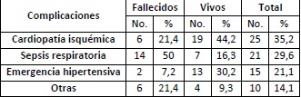 De los 71 pacientes que presentaron complicaciones 28 (39,4%) fallecieron, la cardiopatía isquémica aguda fue la más frecuente con 25 (35,2%) reportes; seguido de la sepsis respiratoria (29,6%) y la emergencia hipertensiva (21,1%), respectivamente. El mayor número de fallecidos se debió a la sepsis respiratoria con 14 (50%) pacientes. (Tabla 2)