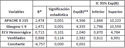 En el análisis univariado observamos que los pacientes fallecidos presentaban un APACHE II a las 24 horas mayor o igual a 15 puntos (OR=10,4; p=0,000; IC 95%=4,9-21,7); una Escala del coma de Glasgow al ingreso ≤ 9 (OR=11,4; p=0,000; IC 95%=5,5-23,8); una enfermedad cerebrovascular hemorrágica (OR=3,9; p=0,000; IC 95%=2,1-7,7) y/o necesitaron de ventilación artificial mecánica durante el ingreso (OR=11,1; p=0,000; IC 95%=4,7-26,3). (Tabla 3)