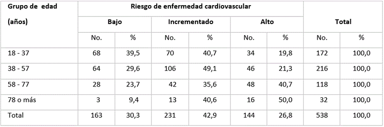 En la Tabla 1 se puede observar que el riesgo incrementado predominó en todos los pacientes (42,9%) y el riesgo de enfermedad cardiovascular alto fue aumentando en correspondencia con la edad. El 40,7% de los pacientes con edad entre 58-77 años presentó riesgo de enfermedad cardiovascular alto, mientras que dicho riesgo se observó en 50,0% de los pacientes con edad entre 78 ó más años. Al aplicar el test Chi Cuadrado se encontró asociación entre ambas variables.