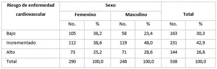 Se puede apreciar en la Tabla 2 que el riesgo de enfermedad cardiovascular que predominó fue el incrementado en ambos sexos, con predominio en el sexo masculino (48,0%). Al aplicar el Test Chi Cuadrado se encontró asociación entre ambas variables.