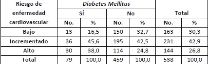 En la Tabla 3 se muestra la presencia de Diabetes Mellitus según riesgo de enfermedad cardiovascular, notándose como en los pacientes con Diabetes Mellitus predominó el riesgo incrementado (45,6%), mientras que el riesgo bajo se observó solo en 16,5% de los diabéticos. Al aplicar el Test Chi Cuadrado se encontró asociación entre ambas variables.