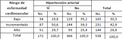 En la Tabla 4 se muestra la presencia de hipertensión arterial según riesgo de padecer enfermedad cardiovascular, y se pudo observar que predominó el riesgo incrementado en 50,6% de los pacientes hipertensos seguido por el riesgo alto (29,7%). Llama la atención que 80,3% de los pacientes hipertensos, (138 pacientes) presentaron riesgo incrementado o alto. Al aplicar el Test Chi Cuadrado se encontró asociación entre ambas variables.