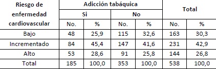 En la investigación desarrollada se observó una relación estadísticamente significativa entre el riesgo de enfermedad cardiovascular y la edad, el sexo, la Diabetes Mellitus y la hipertensión arterial, no siendo significativa la asociación entre el riesgo de enfermedad cardiovascular y la adicción tabáquica. En concordancia con lo encontrado por Ruiz,17) quien plantea que los pacientes con obesidad abdominal presentan una mayor asociación con los factores de riesgo cardiovasculares, excepto con el tabaquismo, lo que incrementa su riesgo global.