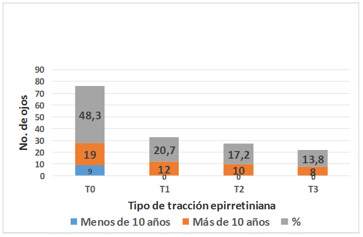 Resultados: Se constataron variaciones del grosor macular por encima de las 250 micras, predominó el engrosamiento cistoide y según la clasificación aplicada y el grado de tracción epirretiniana, se incluyeron más pacientes en los grupos T1 y T2. Finalmente, se clasificó el edema en no traccional (T0 y T1, 69%) y en traccional (T2yT3, 31%).