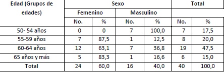 Se observa en la Tabla 1 que el grupo etario de 60-64 años predominó en la muestra, así como el sexo femenino.
