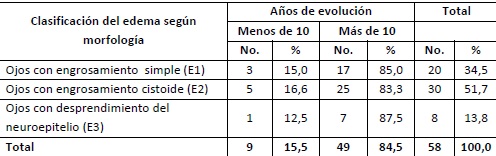 Según la clasificación morfológica utilizada en el estudio, se halló el engrosamiento cistoide en 51,7% de los ojos. En total, 84,5% de los ojos con edema correspondieron a pacientes con más de 10 años de evolución de la Diabetes Mellitus. (Tabla 3)