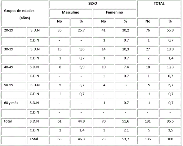 En el sexo femenino y pacientes con edades comprendidas entre 30 y 39 años predominaron los desórdenes neurosensoriales (Tabla 1). Estos reportes coinciden con los estudios de Petersen4 y Masaya Akashi,10 aunque difieren con Raeisian15 en un estudio con menor muestra, toda sintomática donde predominaron pacientes masculinos y con edad hasta 30 años.