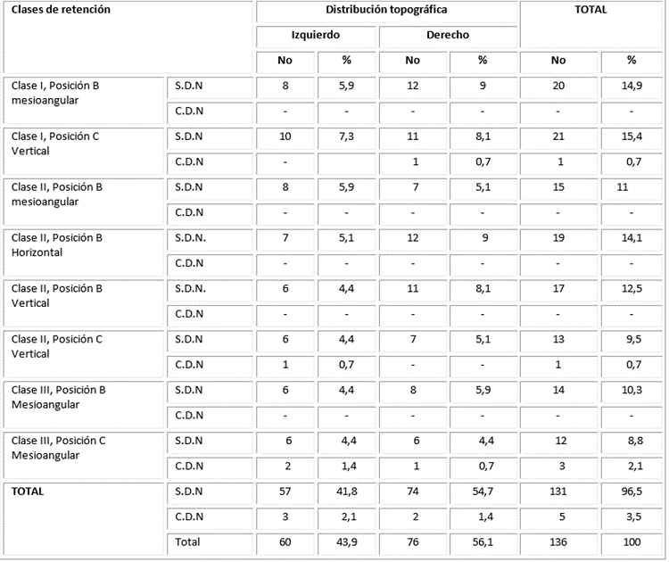 La distribución topográfica y la clasificación de la retención de terceros molares inferiores en relación con la aparición de alteraciones neurosensoriales se presentan en la Tabla 2. Los desórdenes neurosensoriales predominaron en el lado izquierdo 3 (2,1%) y en la variante de retención clase III, posición C, mesioangular con 3 casos (2,1%).