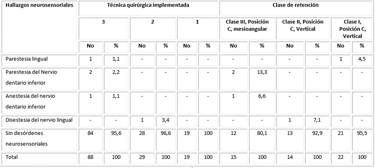 La Tabla 4 refleja la relación existente entre los hallazgos neurosensoriales encontrados, la modalidad de técnica quirúrgica implementada y la clase de retención; apreciándose que el proceder que incluía colgajos, odontosección y ostectomía fue el que presentó mayor número de desórdenes (4) representando un 4,4%, aunque el desorden proporcionalmente más asociado con la técnica implementada fue la disestesia (3,4%) en técnicas con colgajos, con ostectomía sin odontosección. La parestesia del nervio alveolar inferior fue el hallazgo más registrado y se presentó exclusivamente en terceros molares inferiores retenidos clase III, Posición C, Mesioangular en 13,3% de los intervenidos de esta clase. El resto de las modalidades quirúrgicas y de las clases de retención no registraron desórdenes neurosensoriales.