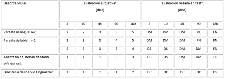 El daño de los nervios periféricos puede clasificarse según Seddon en: neuropraxia, axonotmesis, y neurotmesis.5) Los elementos neurológicos asociados a la técnica más aquejados son el nervio dentario inferior y el nervio lingual,6 y se reflejan clínicamente en zonas de parestesias, hipoestesias, anestesias o disestesias, que usualmente desaparecen en 8 semanas.3 La persistencia tras ese tiempo es considerada baja.5,6,7,8,9