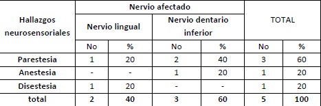La Tabla 3 exhibe la distribución de hallazgos neurosensoriales según nervio afectado. Se aprecia que el nervio dentario inferior fue el más afectado en 3 de los 5 casos registrados con desórdenes (60%). La parestesia fue el hallazgo clínico más reportado y se presentó en 3 casos.
