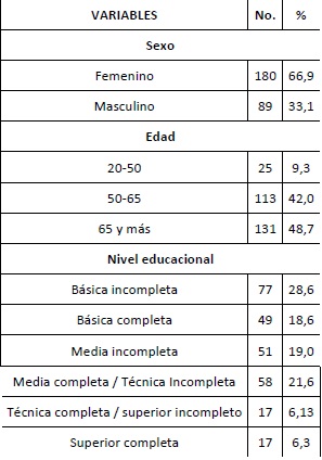 Las principales características de la muestra son: género mayoritariamente femenino con edades sobre 65 años, con escolaridad básica incompleta. (Tabla 1).