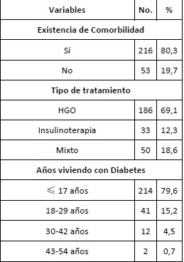 Más de 80% de la muestra presenta otra patología además de la diabetes. En relación al tipo de tratamiento el más frecuente corresponde al uso de los Hipoglucemiantes orales. Sobre los años que los individuos de la muestra llevan viviendo con diabetes, se obtuvo que más de 90% de los usuarios ha padecido la enfermedad por lo menos 29 años. (Tabla 2).