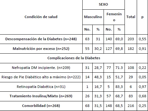 El colectivo femenino en sí, son un grupo desfavorecido.18 Si se observa este grupo en particular, se puede señalar que presenta un grupo etario con edades más avanzadas de vida, con bajos niveles de escolaridad, con una alta frecuencia de morbilidades asociadas, descompensación de la diabetes y malnutrición por exceso. Aunque en esta muestra hay menos varones que mujeres, al parecer llegan a las etapas más avanzadas de la vida en mejores condiciones.