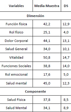 Resultados: La salud física tiene un promedio de 37,8 puntos, mientras que la salud mental tiene un promedio de 34,1 puntos. Todas las dimensiones del SF-12 se encuentran por debajo de media de 50 puntos en una escala de 0-100. En el dominio función física los hombres perciben mejor Calidad de Vida con respecto a lo referido por las mujeres.