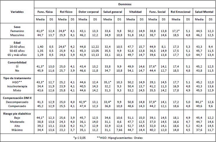 Al evaluar las medias por dominios del SF-12 y algunas variables demográficas, de salud y/o morbilidad, podemos encontrar que en el dominio función física existen diferencias significativas entre hombres y mujeres. Si bien ambos perciben una peor CVRS, el hombre la percibe mejor con respecto a la mujer. Continuando con el dominio función física, se observa además que los usuarios que presentan alguna comorbilidad perciben peor aún la CVRS con respecto a los que no presentan comorbilidades. Algo similar se observa en los usuarios con insulinoterapia, ya que ellos perciben una peor CVRS en la dimensión función física, en comparación con quienes tienen otro tipo de tratamiento. En cuanto a los usuarios con riesgo de pie diabético, se observa que quienes presentan riesgo máximo refieren una CVRS en la dimensión función física aún peor que quienes presentan riesgo de pie diabético bajo. (Tabla 5. Anexo).