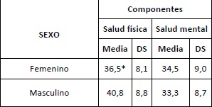 En relación con los componentes del instrumento SF-12, ambos presentan medias por debajo de los 50 puntos en una escala de 0-100. La salud física tiene un promedio de 37,8 puntos, mientras que la salud mental tiene un promedio de 34,1 puntos. (Tabla 4).
