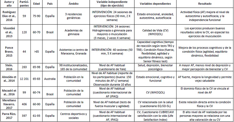 Material y Métodos: Fueron consultadas las bases Google Scholar y Dialnet. Se analizaron las publicaciones de los últimos 5 años. Los descriptores empleados fueron: actividad física en la tercera edad, en los adultos mayores y en los ancianos; ejercicio físico en la tercera edad, en los adultos mayores y en los ancianos. Se excluyeron los artículos relacionados con enfermedades crónicas, demencias o desnutrición, o con cuidadores. Así, fueron seleccionados y analizados un total de 8 artículos.