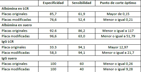Se realizó la comparación de la sensibilidad y especificidad entre las placas originales y las placas que están modificadas por la optimización de las áreas no utilizadas. Estos resultados pueden observarse en la Tabla 2. Como puede apreciarse no existen diferencias significativas en cuanto a sensibilidad y especificidad en la mayoría de las determinaciones en suero y LCR en cuanto a IgG y albúmina menos en el caso de la especificidad de la albúmina en suero.
